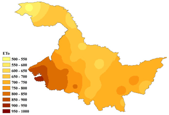 In recent years, based on meteorological station data, some spatial interpolation methods have been applied to study the spatial distributions of ET0 and the climate variations. Due to the fact that the inverse distance weighting (IDW) method gave the lowest mean error, the method is applied widely all over world [3,27,35,36]. Thus, in this study, the IDW method is selected to analyze the spatial variation of ET0.