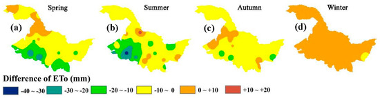 Similar to two recent studies [13,14], our study found that there was a significantly decreasing trend of annual ET0 in the typically high altitude region. The same trend was found in Spring, Summer, and Autumn. In addition, some studies that reported ET0 was significantly reduced in high altitude regions such as the Taoer River Basin [47], the northwest of China [48], and so on. However, we found an increasing trend of ET0 in Winter. Furthermore, the higher the elevation, the more obvious the increasing trend (Figure 8a). In addition, as discussed in the introduction, ET0 has been found to respond differently in different geographical regions. One of reasons is that ET0 had different sensitivities to meteorological variables in different regions [43,49,50].