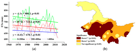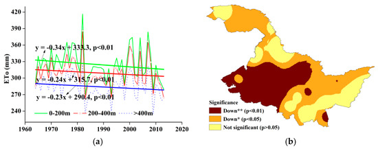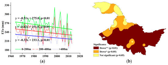 During 1964 to 2013, the average annual ET0 in Heilongjiang Province varied from 722 mm to 633 mm, with a decreasing trend of 7.4 mm ever 10 years (Table 2). Furthermore, different decreasing trends were shown for different elevations (Figure 4a). The trend decreased trend with an increase of elevation (Table 2). The decreasing trend of ET0 was very significant (p < 0.01 or p < 0.05) for most regions from 0 to 400 m and not significant for the northern region above 400 m aor for a few local regions (Figure 4b).