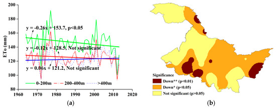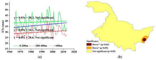 Furthermore, the same trend as for the annual ET0 occured for the ET0 during Spring and Summer, as shown for different elevations in Figure 5a and Figure 6a. The trend is declining with the increase of elevation (Table 3). The decreasing trend of ET0 is very significant (p < 0.01 or p < 0.05) for most regions from 0 to 400 m and not significant for a few local regions (Figure 5b and Figure 6b). A decreasing trend of ET0 in Autumn was shown from 0 to 400 m from 1964 to 2013. However, an increasing trend is shown above 400 m (Figure 7a). The decreasing trend of ET0 is significant (p < 0.05) for most regions from 0 to 400 m and very significant (p < 0.01) in a few local regions. However, no significant level is shown (Figure 7b). A tendency for ET0 to increase in Winter is shown for different elevations from 1964 to 2013 in Figure 8a. In addition, it is worth noting that the trend is most obvious for the region above 400 m, with an increasing trend 0.9 mm every 10 years (Figure 8b).