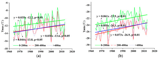 Trend of (a) winter maximum temperature (Tmax), and (b) winter minimum temperature (Tmin) at different elevations from 1964 to 2013 in Heilongjiang Province, northeast China. As the change slopes show, winter Tmin increased much more than winter Tmax in China’s northernmost region. (Green thick and solid line is the linear trend of ET0 at 0–200 m, the Red thick and solid line is the linear trend of ET0 at 200–400 m, Blue thick and solid line is the linear trend of ET0 at >400 m).