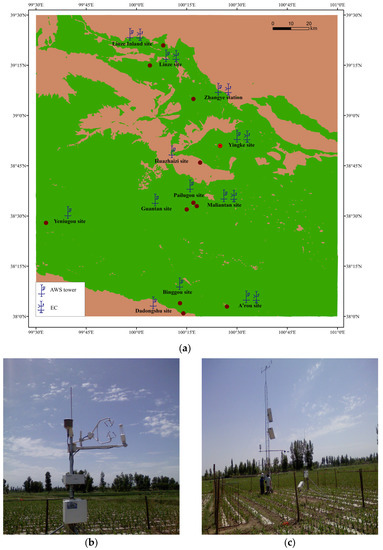 The Watershed Airborne Telemetry Experimental Research (WATER) project chose the Zhangye oasis as a key experimental area for an arid region hydrology experiment in the oasis-desert zone of the middle reaches of the Heihe River Basin []. The terrain is flat, with elevations ranging from 1500 m to 2000 m. The Zhangye oasis is located in the inland arid belt of northwestern China. The artificial oasis, the Gobi Desert, and the transitional zones between the oasis and desert are the dominant landscapes []. The total area of the Zhangye oasis is 4.19 × 104 km2, accounting for 32.23% of the total area in the Heihe River Basin. The vegetation coverage and oasis area accounted for 8.67% and 9.8% of the Zhangye oasis total area, respectively []. In such regions, ET is high, and the water availability is limited. In recent decades, increasing human activities and associated overexploitation or illogical water resource utilisation in the Zhangye oasis have resulted in a series of environmental problems arising in the lower reaches of the Heihe River Basin. Such problems include land desertification and salinisation as well as natural vegetation degeneration. As a result, environmental degradation has become a research focus in recent decades. An equitable partitioning of water resources among competing shareholders and ecosystems along the Heihe River Basin has been hampered by a lack of accurate water budgets, particularly a lack of accurate ET estimates [].