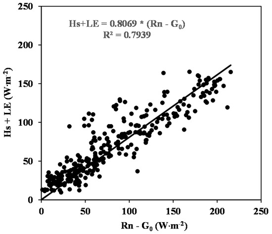 where Rn is the net radiation (w∙m−2), G0 is the ground heat flux (w∙m−2); Hs is the sensible heat flux (w∙m−2); and LE is the latent heat flux (w∙m−2).