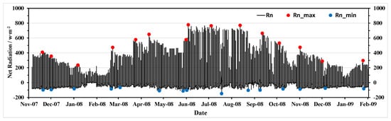 Hourly net radiation (Rn), monthly maximum (Rn_max), and monthly minimum (Rn_min) values of net radiation at the Yingke site from November 2007 to January 2009.