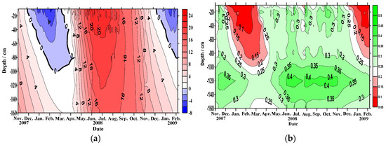 Seasonal variations in the soil temperatures (a, °C) and soil moisture content (b, m3∙m−3) at the Yingke site from November 2007 to January 2009.