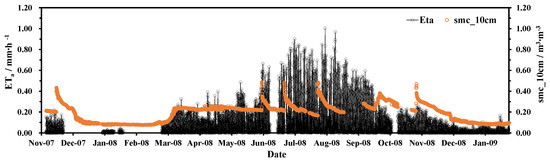 Hourly actual evapotranspiration (ETa) and soil moisture content (smc) at 10-cm depth at the Yingke site from November 2007 to January 2009.