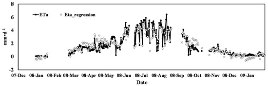 In this study, actual evapotranspiration (ETa) values were mainly obtained by the eddy covariance (EC) method, which is considered an advanced technique for accurately capturing ET information over short-term periods (e.g., 10 min) in a large area []. The EC method does not include assumptions concerning the required eddy diffusivities. Disadvantages of the EC method include dew formation on the instruments during daybreak, which renders the instruments unreliable, and reduced instrument reliability during precipitation events []. EC system monitoring was occasionally interrupted during the observation period because of instrument failure and/or severe climatic conditions, and the missing data were filled in using meteorological data via the aerodynamic method, which is a conventional method for calculating the ETa [].