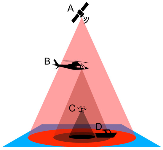 Illustration of the hierarchical monitoring program using (A) satellite, (B) helicopter, (C) drone and (D) field boat to study the mixing of channel plumes in the coastal zone.