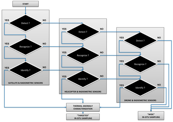Flowchart illustrating the choice of platform in hierarchical monitoring, related to target detect, recognize, and identify criteria. All three platforms may be needed for a set of distinct targets.