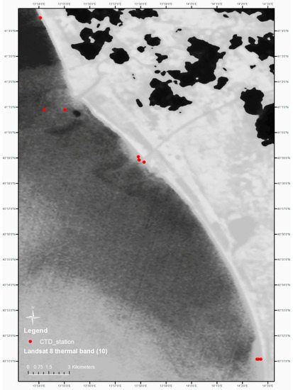 The in situ samples were coordinated to spatially and temporally overlap with the thermal imagery about the discharge plumes (Figure 3). A field boat was provided by the Regional Agency for the Environmental Protection and it carried an Ocean Seven 320 Plus multi-parameter Conductivity Temperature Depth (CTD) probe. The boat was used for in situ sampling to test the correlation with Trad, however, once this was performed subsequent monitoring would not require the costly concurrent collection of in situ samples. To coordinate the spatial congruence of the in situ sampling and proximal sensing, the operator of the field boat navigated to the coordinates of the areas of interest where thermal anomalies in the water were detected, with coordinates sent by radio between the helicopter and boat crews. The CTD in situ samples provided measurement of water kinetic temperature, Tkin, salinity, dissolved oxygen, chlorophyll-a, and turbidity. The CTD records were acquired at a frequency of 24 Hz, the highest allowed by the probes, taking the surficial measurements at 50 cm from the surface. During the CTD acquisitions the wind speeds measured 6 m/s at the weather station close to the sampling area, and this condition suggests the surface layer of the water was completely mixed with a homogeneous Tkin sampled at the 50 cm depth [26].