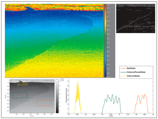 Thermal image of the Volturno plume with polygons over the channel, seawater, and plume areas of interest, which correspond to histograms of radiometric temperature; and (upper right side) edges of the Volturno channel plume as white lines to the right of the image.