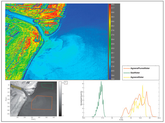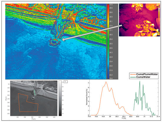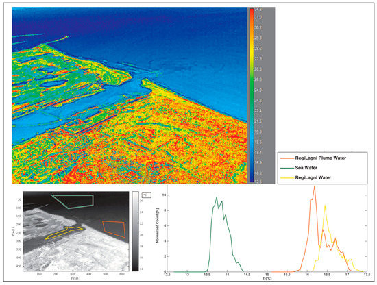 Thermal image of Cuma plume with histogram of radiometric temperature for areas of the channel, seawater, and area of the plume; and (in upper right side) drone-acquired thermal image of the mixing zone in the Cuma channel outlet.