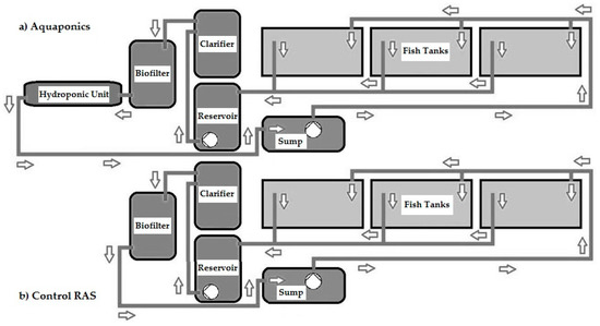 Schematic arrangement and water flow of (a) aquaponics and (b) control recirculating aquaculture system (RAS).
