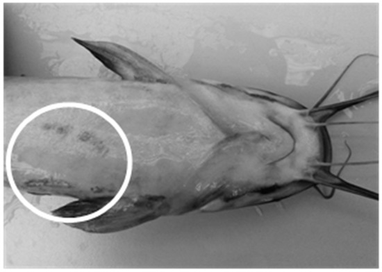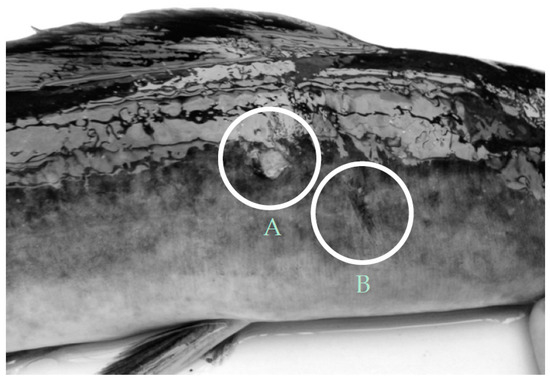 The gender and possible external body injuries were counted. This was conducted by the same two trained persons on every sampling day. All fish were treated independently, and if it was unclear whether a wound should be counted or not, these two persons made a decision. The documentations included only fresh excoriations that were not already in the healing process, i.e., secondary skin lesions (Figure 2, A) or larger fin and barbel damages, but no wounds with renewed mucus or epidermal abrasions (Figure 2, B) or restored skin structures with the regeneration of a new basement membrane cell layer [30]. Furthermore, we did not differentiate between the various lesion sources, e.g., ulcerative skin lesions or those caused by intraspecific competitions and fights (Figure 3).