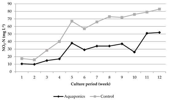 Temporal changes of nitrate (NO3-N) over the experimental period of 12 weeks.