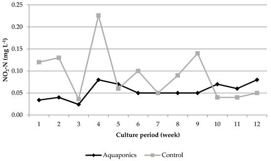 Temporal changes of nitrite (NO2-N) over the experimental period of 12 weeks.