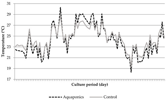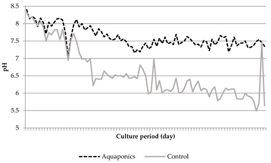 Particularly during the last days of the experiment, TAN reached higher levels in the control RAS (Figure 7). The temperature varied over the experiment, but it was mostly between 22 and 27 °C in both RAS (Figure 8). Oxygen was usually approximately 0.2 mg L−1 lower in the control system (Figure 9). There, the starting pH-value of 8.3 fell more rapidly than inside the aquaponic system and levelled off in the range from 6 and 6.6, while it fell more slowly and remained at approximately 7.5 in the aquaponic system (Figure 10). The oyster shells could not buffer the pH sufficiently in the control system. EC increased relatively quickly in the control system. It started at about 500 μS cm−1 and ended at 768 μS cm−1 in the aquaponic system and at 1286 μS cm−1 in the control system (Figure 11).