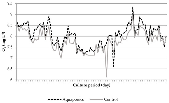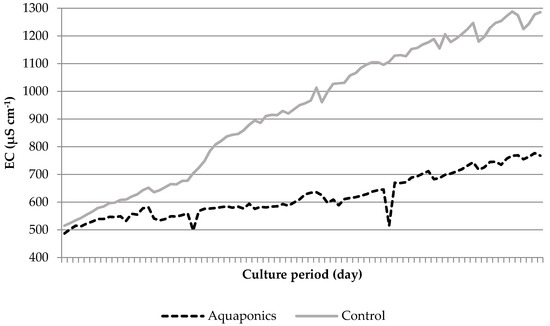 Comparison of the control RAS and the coupled aquaponic system revealed significant differences, resulting in higher EC, ammonium, nitrite and nitrate levels and lower pH and DO in the former. This is a direct consequence of the hydroponic unit within the aquaponics. Though a deep water hydroponic unit always increases the total water volume (here by an additional 750 L), thereby diluting solutes, the plants help to remove harmful substances emanating from the fish. Therefore, the hydroponic unit helped to maintain system stability for a longer time, particularly under higher TAN levels caused by the small size of the attached biofilters. All nitrogen-compounds were lower inside the aquaponics; the pH was more stable; and also the EC remained at a lower level (up to 786 μS cm−1) compared with the control RAS (1286 μS cm−1). Due to the higher ammonium level, the pH-value in the control RAS was lowered to a higher extent. The amount of oyster shells we used could not sufficiently slow down this development. As can be seen in the good growth of the plants including fruit harvesting (see below), the plants must have absorbed the respective nutrients [36]. Furthermore, minerals were absorbed, so they slow the accumulation and were responsible for the lower EC inside the aquaponics. Because we did not observe larger anaerobic sections in either system, degassing through denitrification was not responsible for the reduced nitrate levels inside the aquaponic system.