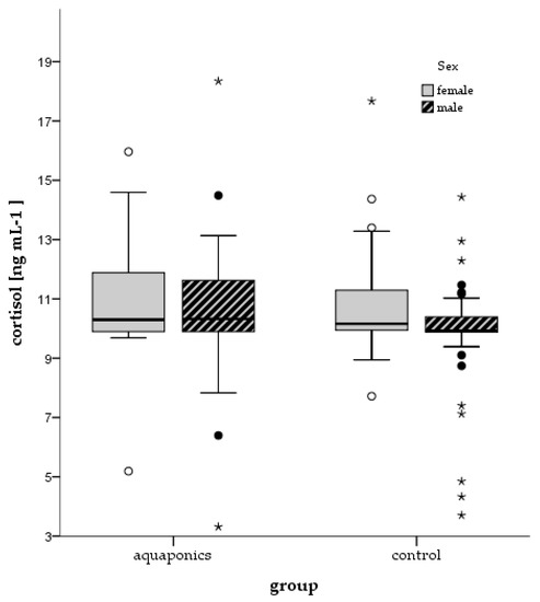 The chronic stress response based on the rearing conditions showed no significant differences between the treatment groups. Cortisol levels were almost the same, even between the different genders in the same group. Most fish had cortisol levels between 10 and 12 ng mL−1 (Figure 12). The mean cortisol levels at the end of the experiment were slightly increased in the RAS with 14.7 ng mL−1 and in the aquaponics with 12.7 ng mL−1. Larger temporal changes of the cortisol response were not detected (cf. Table A1).