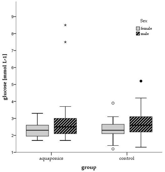 The metabolic responses showed no significant differences between the treatment groups. Most fish had a blood glucose level between 2.0 and 3.0 mmol L−1. The males tended to have a slightly higher blood glucose level than the females in each group. A few bigger males had blood glucose values up to 8.5 mmol L−1 (Figure 13). The mean glucose level at the end of the experiment was 3.2 mmol L−1 in both systems. There were only minor temporal increases over the experiment (cf. Table A1).