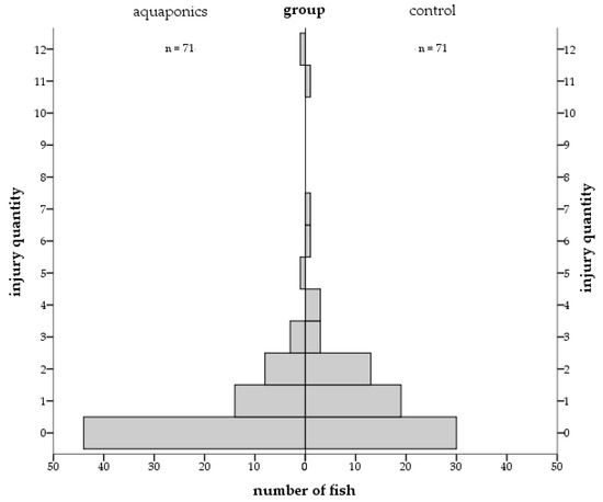 The number of external injuries per individual fish differed significantly between the two treatment groups in both sampling methods (cf. Section 2.5). The aquaponic group showed more fish with an entirely healthy skin with no injuries and flawless fins and barbels, whereas the control group included more fish with one or two skin lesions or flawed fins and barbels within the sampling of small groups over the entire experiment (Figure 14). The average number of skin injuries was 1.3 (RAS) and 0.8 (aquaponics). Within the sampling at the end of the experiment, the number of fish with 0, 1, 2, 3 and 4 injuries was 26, 9, 7, 7 and 2 (control RAS) and 43, 10, 1, 0 and 0 (aquaponics), respectively. Therefore, in the final sampling, no fish in either the control RAS or the aquaponics had more than four injuries, with a significant difference p < 0.05 (average 1.0 for control RAS and 0.2 for aquaponics). In both sampling methods, more than 95% of the wounds seemed to be the result of intraspecific behavior in both RAS. Variations between the tanks were determined: the sampling of smaller groups over the entire experiment revealed average injury numbers of: 1.04, 0.64 and 0.67 for the three aquaponic tanks, respectively; in the control tanks: 0.72, 1.44 and 1.71, respectively. While the final sampling the aquaponic system revealed 0.22, 0.17 and 0.28 injuries, respectively, in the control system: 0.94, 1.44 and 0.53 injuries were observed, respectively (also, cf. Table A1).