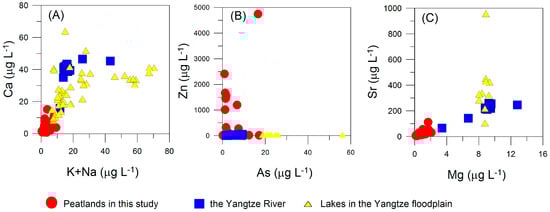 Diagrams showing the difference among peatlands, rivers, and lakes based on (A) Ca, K+Na; (B) Zn and As; and (C) Sr and Mg. Water chemistry data of rivers and lakes in the Yangtze basin are cited from the References of [29,30,31].