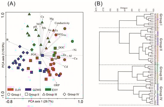 (A) Principal component analysis (PCA) ordination diagram of samples based on environmental parameters; (B) cluster analysis of samples using the method of Ward’s minimum variance. The color code represents samples from DJH (D), QZMS (Q), and EXY (E), and the symbol code in (A) represents the four groups.