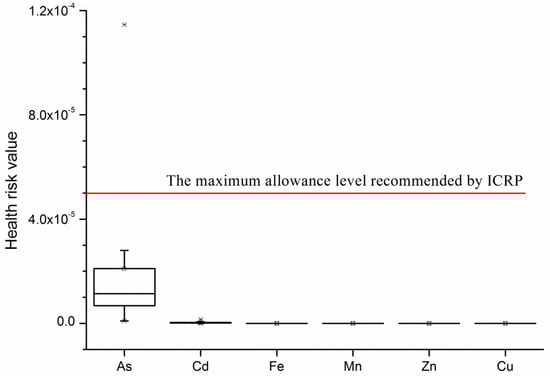 In total, the mean health risk value of the six elements was 3.5 × 10−6 a−1, indicating a low health risk in these peatlands (for details, see Supplementary Table S3). Based on the mean health risk values, the health risk of the assessed elements was in the order of As > Cd > Fe > Cu > Mn > Zn (Figure 4). Compared with the other five elements, As displayed a relatively high risk value. The risk values of As in five samples (two from Dajiuhu Peatland and three from Erxianyan Peatland) exceeded the maximum allowance level (5 × 10−5 a−1) recommended by the International Commission on Radiological Protection (ICRP).