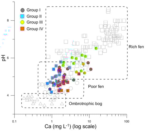 Calcium concentrations and pH in water samples of the three peatlands (filled shapes) and their classification according to Sjőrs and Gunnarsson (2002) (non-filled shapes). D, Q and E represent sampling points from DJH, EXY and QZMS, respectively.
