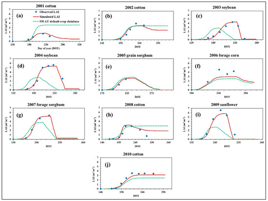 Model performance for yield simulations decreased considerably relative to the baseline scenario (Figure 4b). For instance, the NSE and PBIAS values were 0.67 and 40% (baseline NSE and PBIAS: 0.99 and 1.3%) under the auto-irrigation scenario of a SWD threshold of 36 mm, which achieved the best model performance for ET simulation among the auto-irrigation scenarios. Notably, the auto-irrigation scenario simulated substantially higher yields of cotton (>50%), forage corn (70%), and forage sorghum (40%), as compared to the observed data (Figure 4b). As for the LAI values, clear differences were found for cotton in 2002, 2008, and 2010 under the auto-irrigation scenario of a SWD threshold of 36 mm (Figure 6). Cotton is a perennial shrub that is cultivated as an annual cash crop in the U.S. [35]. Vegetative growth continued under well-irrigated conditions. The observed maximum LAI was used as the input for each crop in this study, which was necessary for the reasonable match of the LAI for other crops under the auto-irrigation scenarios.