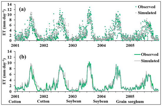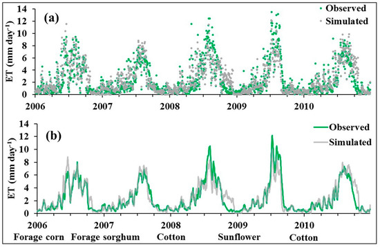 SWAT simulated daily (a) and seven-day running average (b) ET versus observed ET of the irrigated lysimeter field during the validation period (2006–2010).