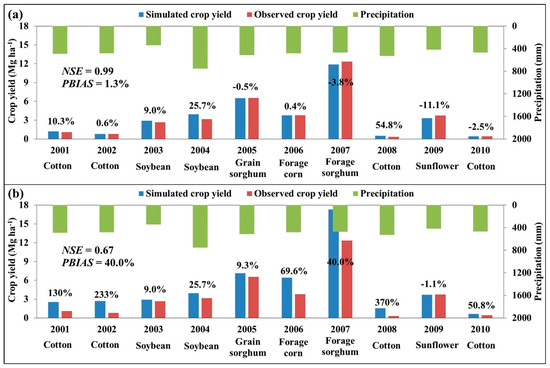 A large PBIAS resulted for soybean yield in 2004 (25.7%) and cotton yield in 2008 (54.8%). Through a SWAT simulation, Chen et al. [33] also found a large inter-annual variation for irrigated cotton yield simulation in the Southern High Plains of Texas. Another SWAT simulation reported that the simulation accuracy of irrigated cotton yields was much worse than those under dryland conditions (NSE of irrigated and dryland cotton: −0.61 vs. 0.4) in the North Fork River Basin of Southwestern Oklahoma and the Texas Panhandle [34]. Increased precipitation in 2004 and 2008 may have contributed to the large inter-annual variation of soybean in 2004 and cotton in 2008 in this study. Cotton and soybean have perennial crop characteristics, and their indeterminate nature may contribute to their difficulty of simulation. During high rainfall years, cotton and soybean, and particularly cotton, tend to continue growing past their desired growing season. Regarding all other years, the PBIAS was within ±15% (Figure 4a).