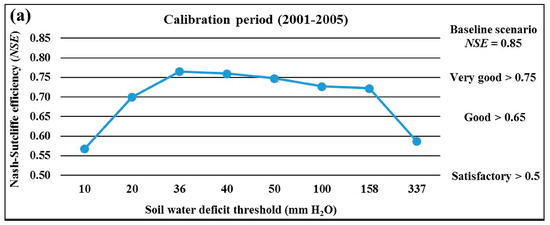 Model performance statistic of NSE for daily measured and simulated ET during (a) calibration (2001–2005) and (b) validation (2006–2010) periods under different soil water deficit thresholds using SWAT auto-irrigation functions.