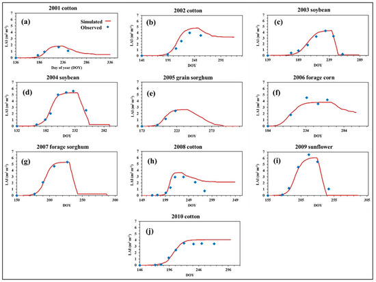 Simulated vs. measured leaf area index (LAI) values for crops under the irrigated lysimeter field from 2001 to 2010.