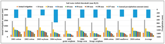Interestingly, the SWAT model achieved a good range of model performance in ET simulations under SWD thresholds ranging from 36 mm to 158 mm. This suggests that a large uncertainty in the simulation of hydrologic parameters may exist when using the soil water content method of the auto-irrigation function in the SWAT model. Further analysis of relative amounts of auto-irrigation associated with each SWD trigger was shown in Figure 7. The irrigation amount was set to 25.4 mm (1 inch) in each trigger for all simulations. Therefore, the lower SWD trigger values (10 mm and 20 mm) resulted in frequent irrigations (>300 times vs. 198 times of the baseline scenario) that exceeded field capacity, resulting in the gross overestimation of total irrigation as compared to actual irrigation (Figure 7 and Table 6). Conversely, larger SWD triggers (>40 mm) resulted in corresponding decreases in total simulated irrigation frequencies (<197 times), due to the delay of the initial irrigation, as a greater amount of soil water depletion was allowed before an irrigation event was triggered (Table 6). In general, the actual total seasonal irrigation was approximated to the 36 and 40 mm SWD trigger scenarios. However, total irrigation amounts associated with the majority of SWD thresholds were larger than the actual irrigation amounts for cotton and soybeans (Figure 7). Although the simulated irrigation under different SWD triggers often bracketed actual seasonal irrigation, these simulated values were biased. Use of the soil water content option of the auto-irrigation function resulted in excess irrigation due to the application of irrigation water after crop maturity and in non-growing season. In essence, water is applied strictly based on the SWD trigger and does not terminate following the killing operation. This is a critical flaw in the soil water content method of the SWAT auto-irrigation function. The low NSE values for the 10 mm SWD trigger, during both calibration and validation periods, were caused by excessive irrigation due to the SWD trigger being less than each irrigation amount of 25.4 mm. However, the low NSE value for the 337 mm SWD trigger in the calibration period was likely due to the minimal irrigation applied to the 2004 soybean and 2005 grain sorghum, with both years receiving relatively high amounts of precipitation. Compared to the baseline scenario, the 36 mm and 40 mm SWD triggers showed the most reasonable number of irrigation frequencies (Table 6). However, the differences in irrigation frequency for 2001 and 2010 cotton and 2003 soybean were visible.