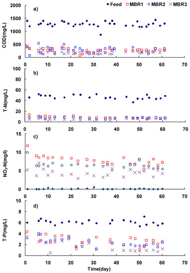 The membrane bioreactor (MBR) process is a biological wastewater treatment process with enhanced solid-liquid separation by the use of a membrane in the conventional activated sludge system [5]. In the MBR, adoption of long solids retention time (SRT) is possible, which usually allows high biomass concentration and good operation flexibility [6]. These advantages are also needed for treatment of high-strength wastewater like wastewater from food waste disposer system [7,8,9]. In recent years, the MBR coupled with the pre-denitrification has been used for treating many types of wastewater [10,11]. In MBR operation, HRT is an important operation parameter [12] since HRT values are directly related with the volume of reactors and removal performance [13]. In a submerged MBR for the treatment of food wastewater, HRTs in the range of 15–30 h produced effluents with acceptable water qualities. Although the treatment capacity increases with lower HRTs, lower HRT has been reported to cause increase in the rate of membrane fouling in MBRs [12]. Membrane fouling and the need of cleaning could result in higher operational and maintenance costs compared to the conventional activated sludge system.