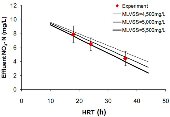 For the given amount of nitrogen concentrations and IR, the effect of the HRT on the effluent nitrate concentration is illustrated in Figure 3.