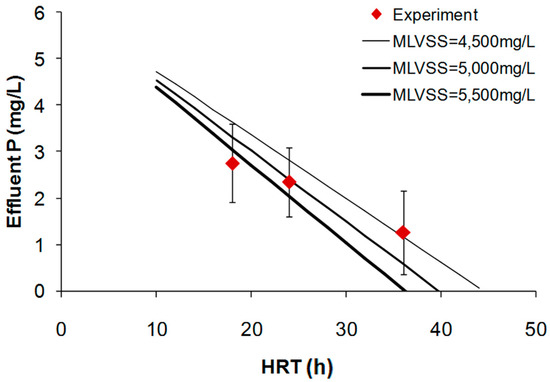 The removal of phosphorous from wastewater can be achieved by wasting the biomass that accumulates phosphorus by cell assimilation. Theoretically, phosphorus removal of the treatment system is governed by wasting of excess sludge biomass and it is also dependent on the biomass growth rate. Therefore, phosphorus concentration of effluent could be expressed as a function of HRT under the fixed SRT condition as follows [32]: