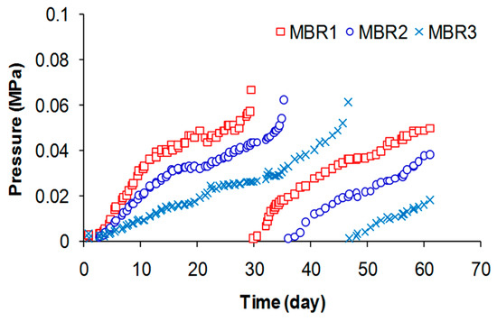In the experiments, the permeation of membrane was conducted at three constant fluxes of 15, 11.25 and 7.5 L/m2-h, corresponding to HRT (h) of 18 (MBR 1), 24 (MBR 2), and 36 (MBR 3), respectively. Transmembrane pressure (TMP) was monitored to examine the trend of the membrane fouling under three different flux conditions, and the result are shown in Figure 5.
