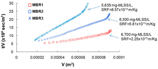 To determine the specific resistance of the sludge to filtration, dead end filtration experiment was conducted. The time to permeate volume (t/V) versus the cumulative permeate volume (V) was plotted to calculate the specific resistance of filtration (SRF) (Figure 6).