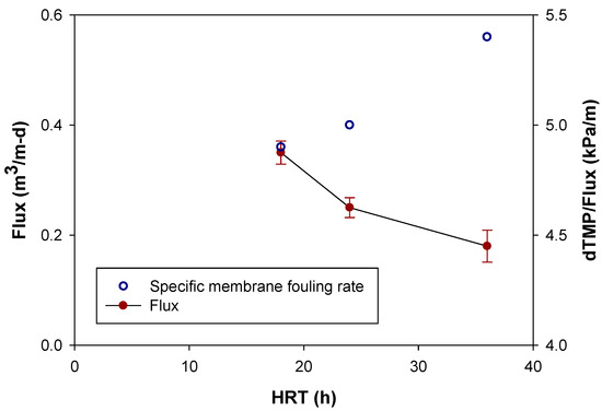 Finally, the specific membrane fouling rate, the rate of TMP increase per the specific flux set (dTMP/Flux), was plotted along given HRT (Figure 7).