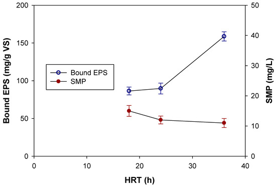 The SRF value was calculated by linear regression for the given filtration data normalized by concentration of MLSS [39]. The data clearly showed that higher SRF, an indicator for the higher membrane fouling, was seen with lower HRT. This result is consistent with the TMP data described above (Figure 5), indicating that system HRT has a large effect on the membrane fouling.