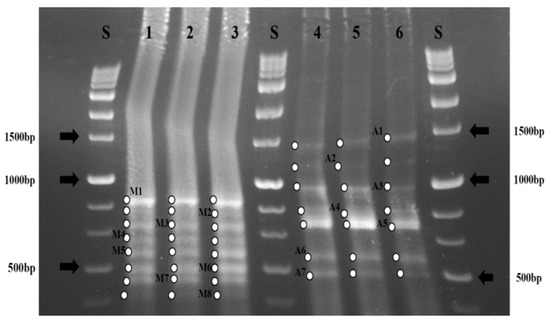 RFLP pattern analysis of bacterial 16S rRNA gene digested with MspI; Lane 1 = MBR1; Lane 2 = MBR2; Lane 3 = MBR3 in the aerobic membrane reactor; Lane 4 = MBR1; Lanes 5 = MBR2; Lane 6 = MBR3 in the anoxic activated sludge reactor.