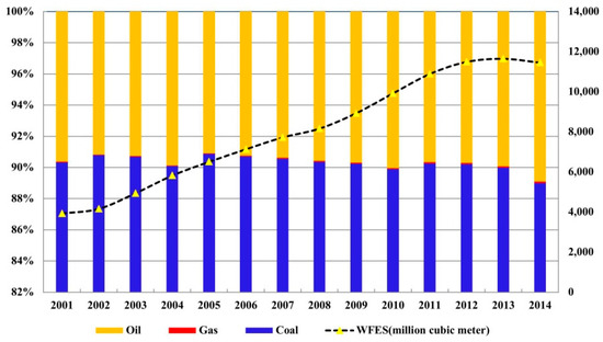 Figure 1 shows the blue component of WFEP (hereafter referred to as the WFEP) in China for the period from 2001 to 2014. The WFEP in 2014 in China was approximately 10,138.9 million m3, approximately 2.6 times that in 2001. Coal’s share of the total WFEP rose steadily and reached a maximum in 2012. By contrast, oil’s share continuously reduced before 2012 and subsequently increased in 2013 and 2014. In general, the trend in the WFEP was upward for all three fuels over the past 14 years, and each showed slight declines in individual years (such as oil in 2009 and coal in 2014). For the WFEP of coal, the reason for the decrease in 2014 was mainly due to production, and it first dropped in 2001 under the new energy restructuring situation. For oil production, it first dropped in 2009 and may have been affected by the financial crisis. Although gas made up only a tiny percentage of the WFEP during the 14 years, that percentage consistently grew, with an average annual growth rate of approximately 26%, and the share may continue to expand.