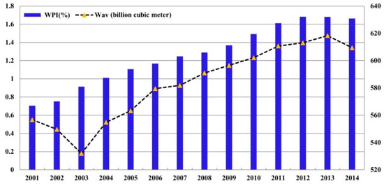 Figure 4 shows that the WPI continued to increase until 2012 and then it slightly decreased in 2013 and 2014. This result indicates that the increase in the consumption of fossil energy resources in China escalated the water pressure in China, although this was somewhat mitigated in the last two years. Thus, the energy-water nexus in China should not only focus on water for energy generation, but it should also pay more attention to the extraction of the energy source for power generation. Fossil energy production has given rise to issues related to water security in China.