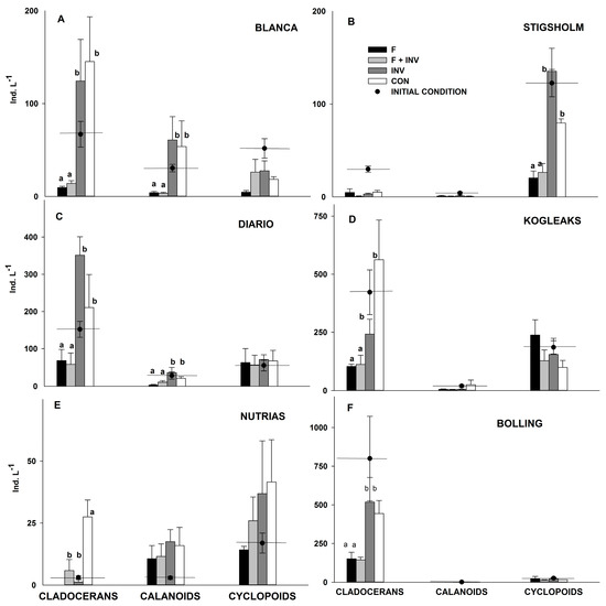 Effects of experimental treatments on the abundance of zooplankton in subtropical (pannels A, C and E) and temperate (panels B, D and F)) lakes. Dotted and horizontal lines represent the initial conditions (just before treatment assignment and 15 days after fish exclusion), while columns show the final conditions (49 days after fish and macroinvertebrate addition). F (fish); F + INV (fish + predatory macroinvertebrates) and INV (predatory macroinvertebrates). Error bars represent ±1 standard error. Please note the different scales on the y-axes. Letters indicate groups based on Tukey’s post hoc tests when ANOVA tests were significant.