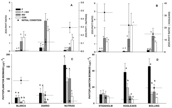 Effects of treatments on potential zooplankton grazing pressure (A,B) and phytoplankton biomass (C,D) in subtropical (left) and temperate (right) lakes. Dotted and horizontal lines represent initial values (just before treatment assignment and 15 days after fish exclusion), while columns depict final values (49 days after fish and invertebrate addition). F (fish); F + INV (fish + predatory macroinvertebrates) and INV (predatory macroinvertebrates). Error bars represent ±1 standard error. Please note the different scales on the y-axis. Letters indicate groups according to Tukey’s post hoc tests when ANOVA tests were significant.