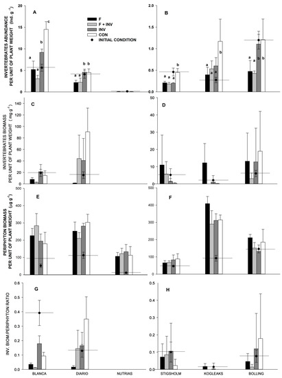 The invertebrate to periphyton biomass ratio (InvBiom:periphyt) was also calculated by dividing the sum of gatherers, shredders and scrapers invertebrate biomasses (mg/g plant) by periphyton biomass (μg/g plant) measured as Chl-a (Chl-a concentration converted to periphyton DW, using a Chl-a:C ratio of 30 and a DW:C ratio of 2.2 [54]). We recaptured the added fish and predatory macroinvertebrates (P. argentinus and G. lacustris) after the final sampling (TF) by electro-fishing and by vigorously sweeping a hand net inside the mesocosms.