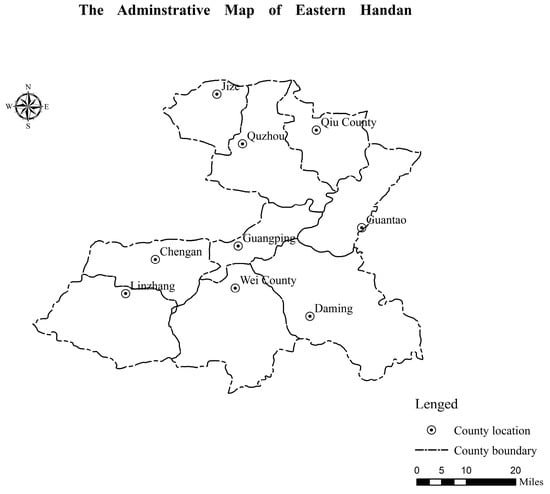 The eastern part of Handan is 4271 square kilometers, accounting for 36% of the total area of Handan, and the geographical position is 36°6′–36°57′ in north latitude, longitude 114°24′–115°29′. Administrative division includes Linzhang County, Cheng’an County, Guangping County, Quzhou County, Jize County, Daming County, Wei Country, Guantao County, and Qiu County, which is shown in Figure 1.