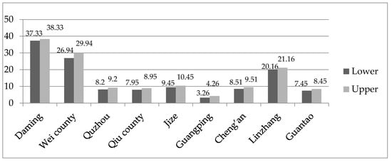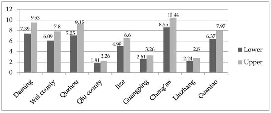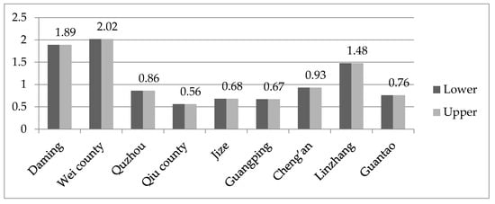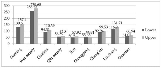 Figure 5 shows the total water quantity of allocating to agriculture in each region from different water resources. It is noted that the total amount of agricultural water demand is [859.63, 1375.17] × 106 m3, the amount of water allocated to agriculture is [917.19, 1022.28] × 106 m3. So there is a deficit of 352.89 × 106m3 with the average deficiency rate being 25.6% under the upper water demand. Further, the top four water shortage counties of larger than the average water deficiency rate are Quzhou County, Guangping County, and Jize County with their deficient rate being 33%, 27%, and 28%, respectively. Based on the above results, it can be obtained that the water supply can fully meet requirement when the water demand equals to the lower bound. Conversely, when the water demand equals to the upper bound, the serious water shortage user is agriculture, while the serious water shortage counties are Quzhou County, Guangping County, and Jize County (whose average deficit rate are 33%, 27%, and 28%, individually).